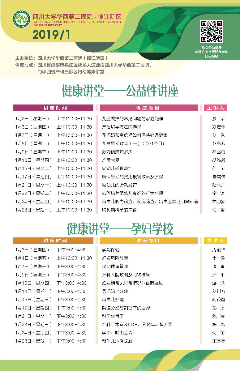 四川大学华西第二医院2019年1月健康教育公益讲座课程表--锦江院区