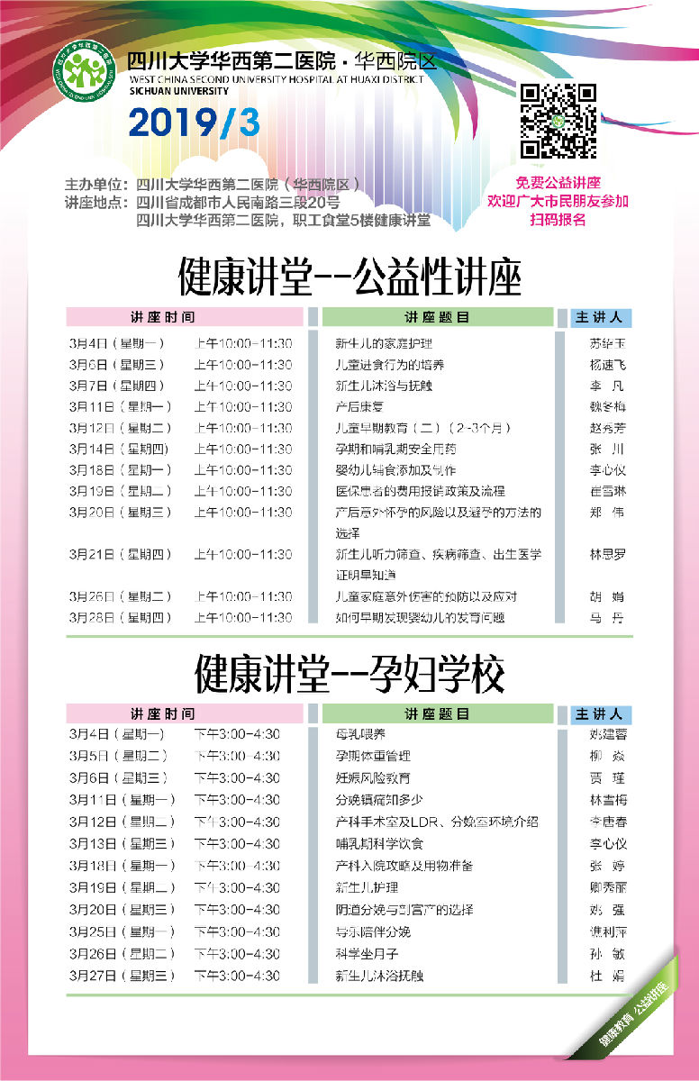 四川大学华西第二医院2019年3月健康教育公益性讲座课程表--华西院区