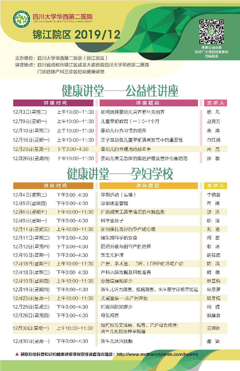 四川大学华西第二医院2019年12月健康教育公益性讲座课程表--锦江院区
