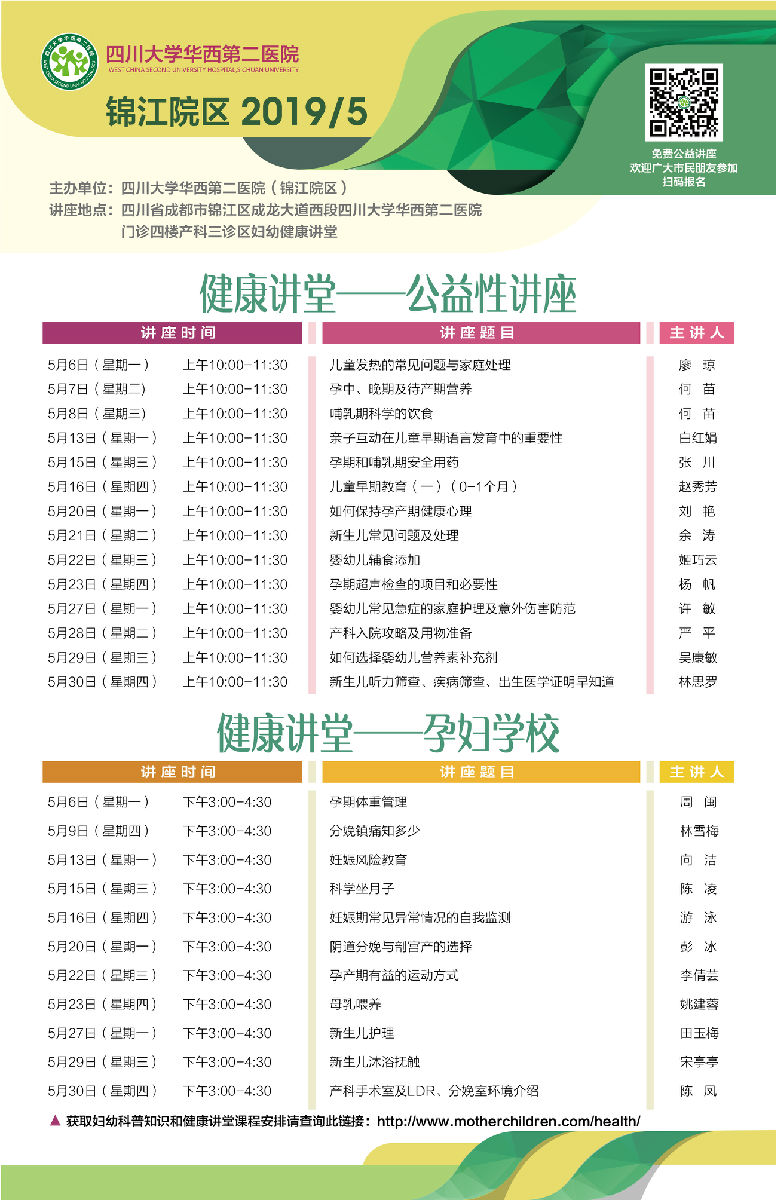 四川大学华西第二医院2019年5月健康教育公益性讲座课程表--锦江院区