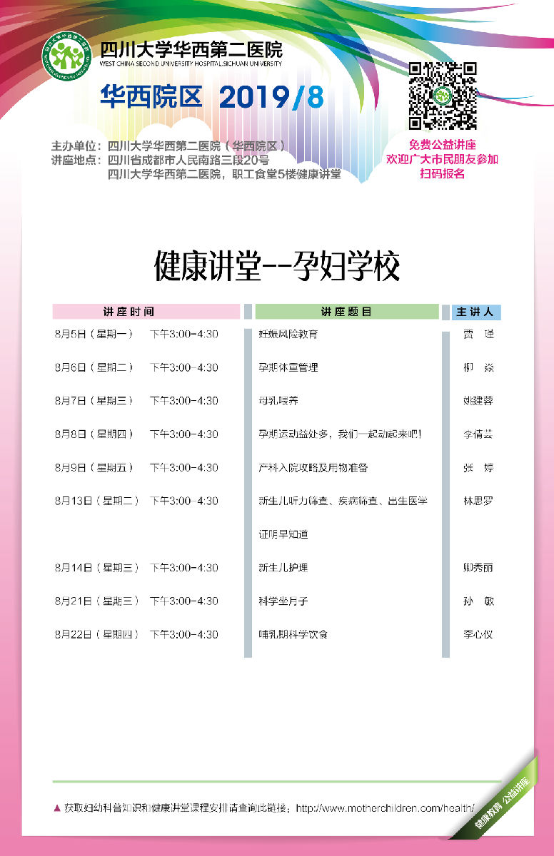 四川大学华西第二医院2019年8月健康教育公益性讲座课表--华西院区
