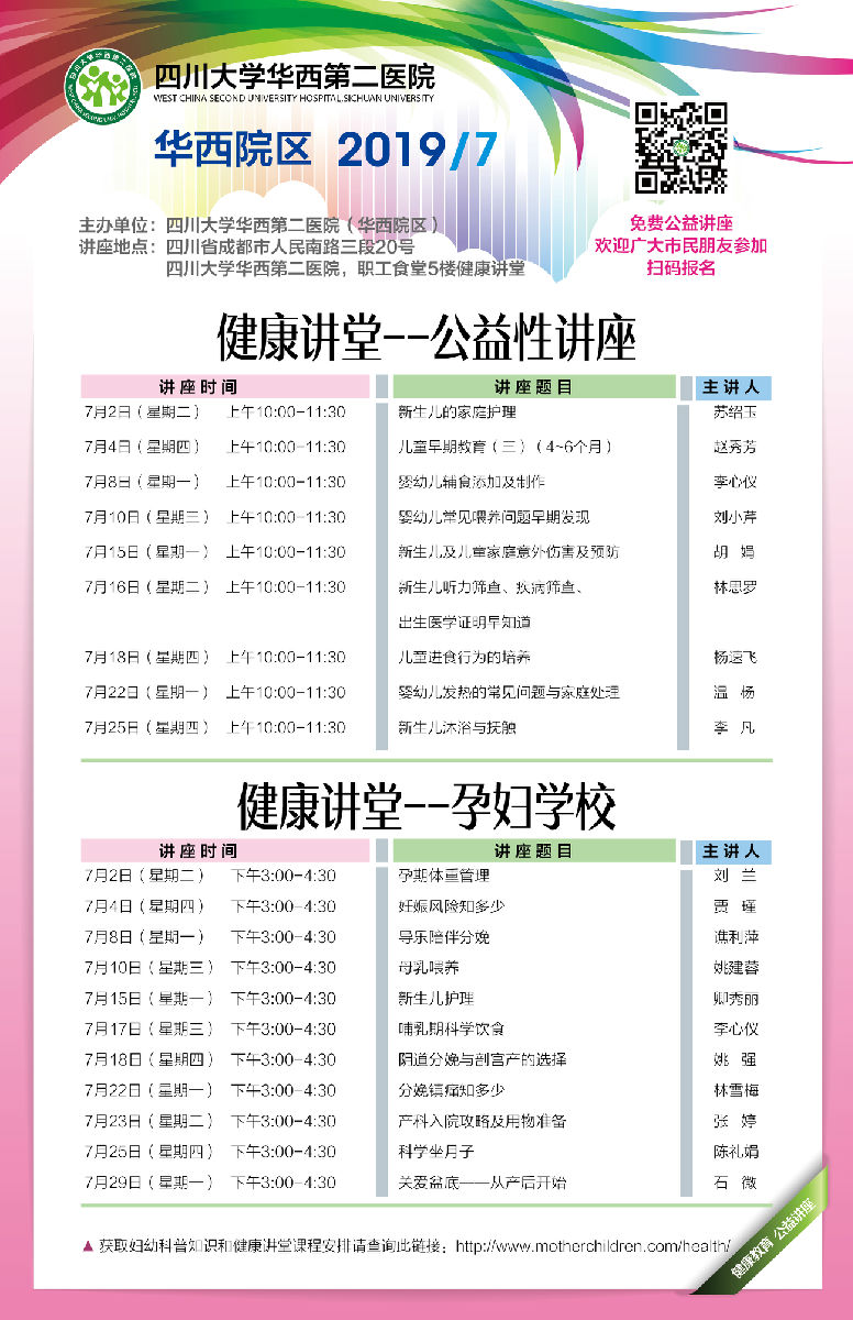 四川大学华西第二医院2019年7月健康教育公益性讲座课程表--华西院区