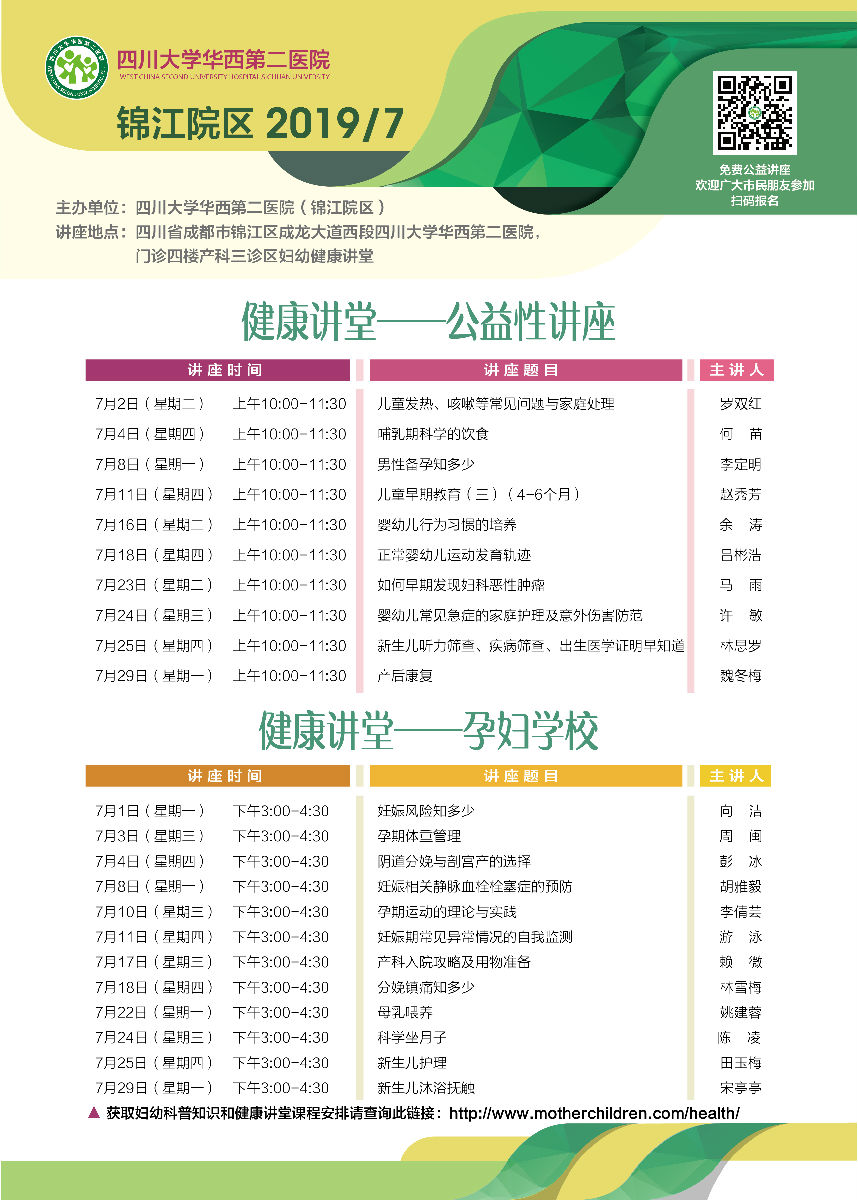 四川大学华西第二医院2019年7月健康教育公益性讲座课程表--锦江院区