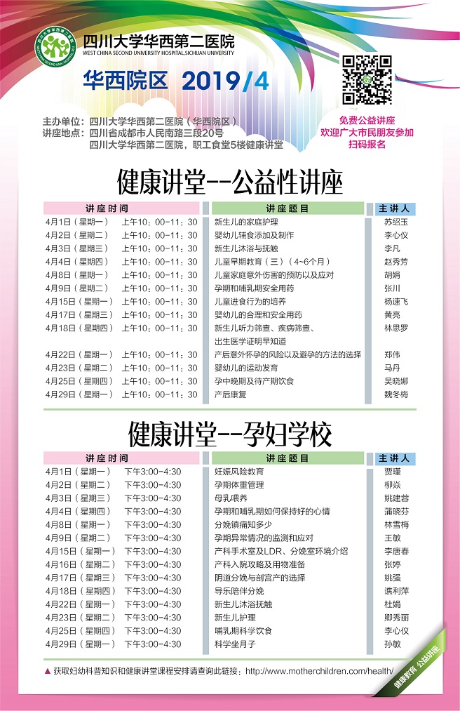 四川大学华西第二医院2019年4月健康教育公益讲座课程表--华西院区