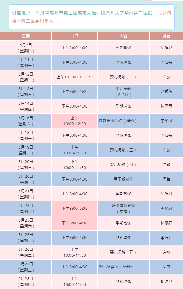 听课地址:四川大学华西第二医院锦江院区,门诊四楼产科三诊区孕妇学校。预报名请扫二维码。