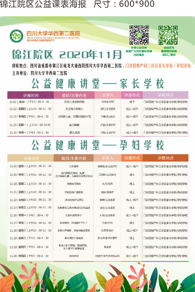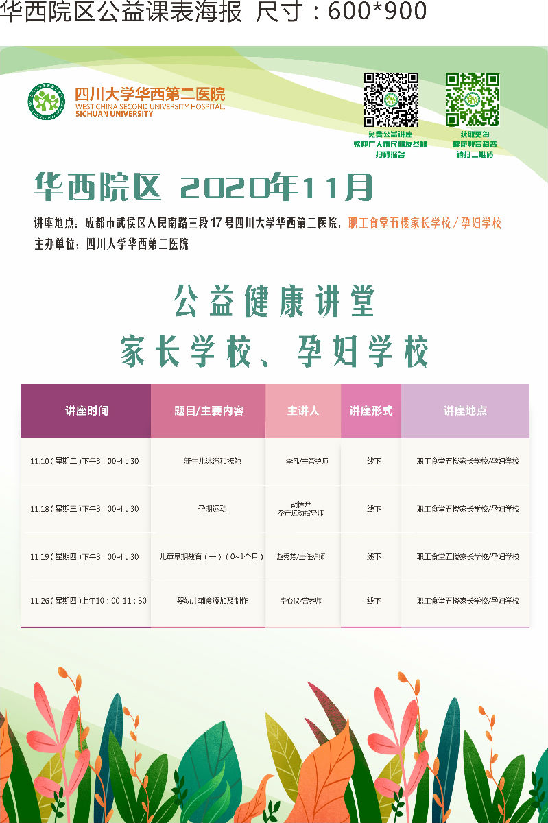 四川大学华西第二医院2020年11月公益家长学校/孕妇学校课程表