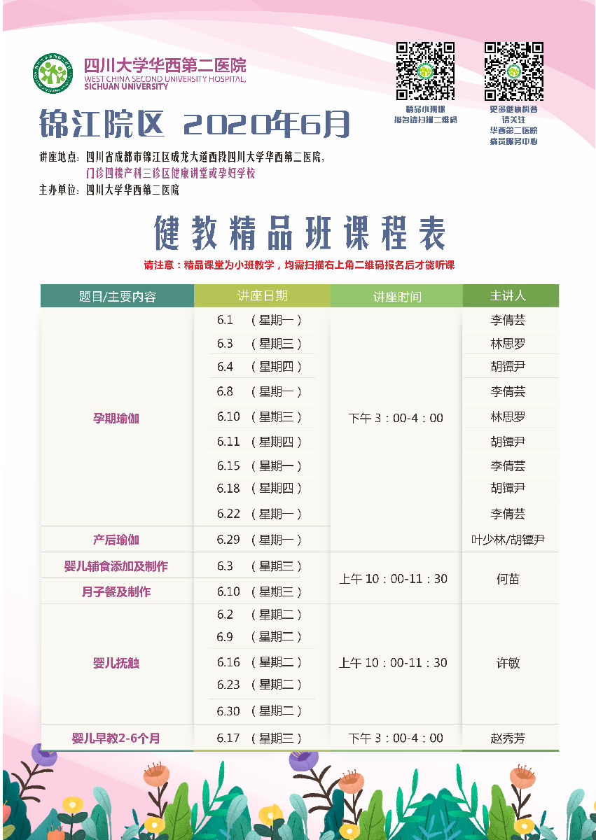 四川大学华西第二医院2020年6月健康教育精品班课程表