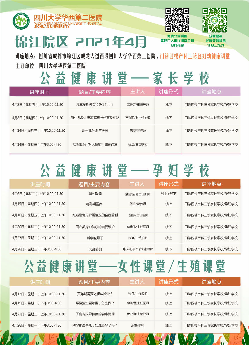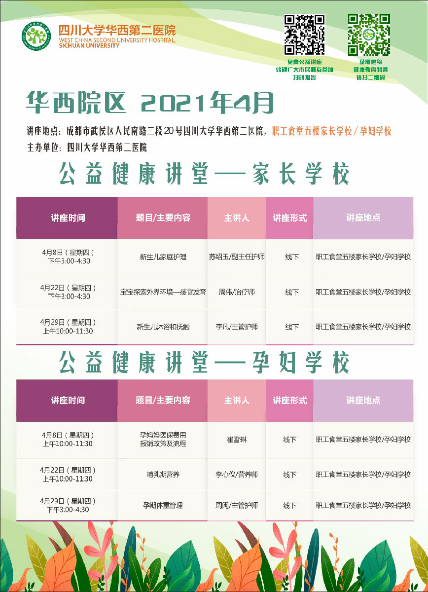 四川大学华西第二医院2021年4月公益家长学校/孕妇学校课程表