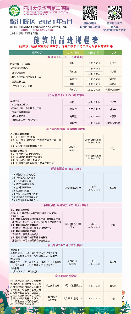 四川大学华西第二医院2021年5月健康教育精品班课程表