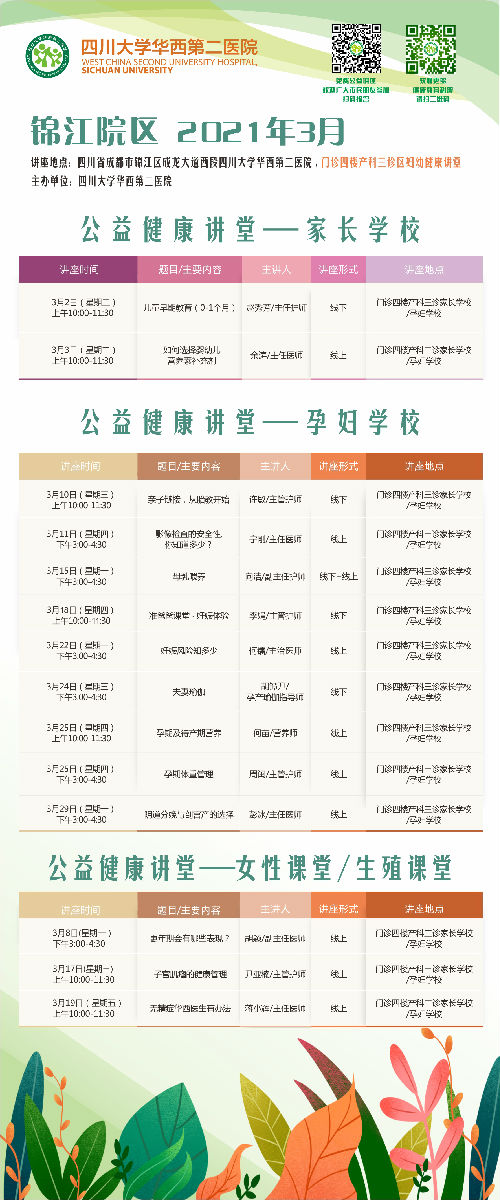 四川大学华西第二医院2021年3月公益家长学校/孕妇学校课程表