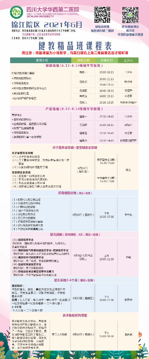 四川大学华西第二医院2021年6月健康教育精品班课程表