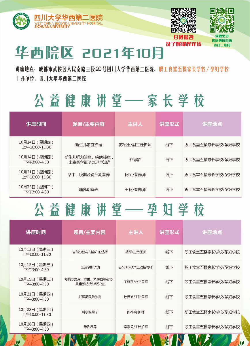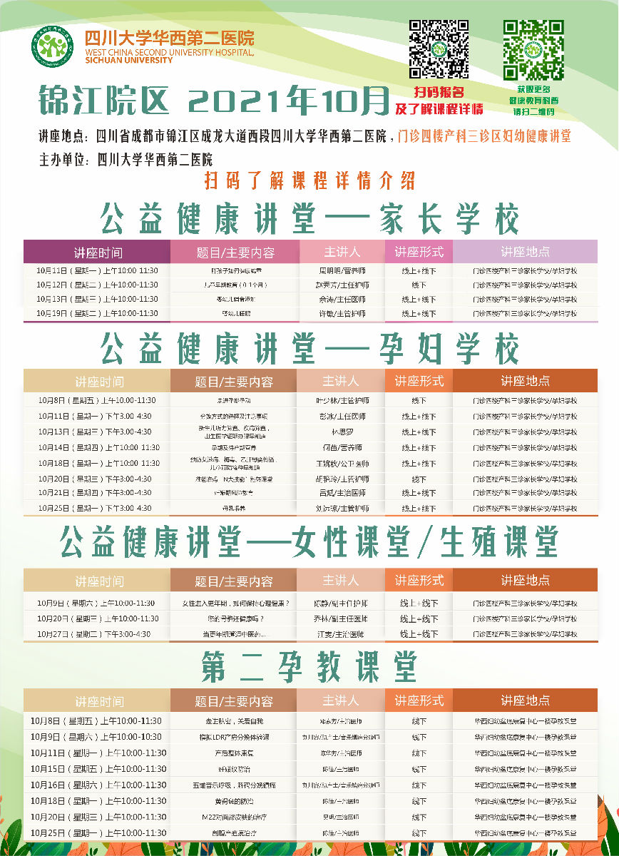 四川大学华西第二医院2021年10月公益家长学校/孕妇学校课程表