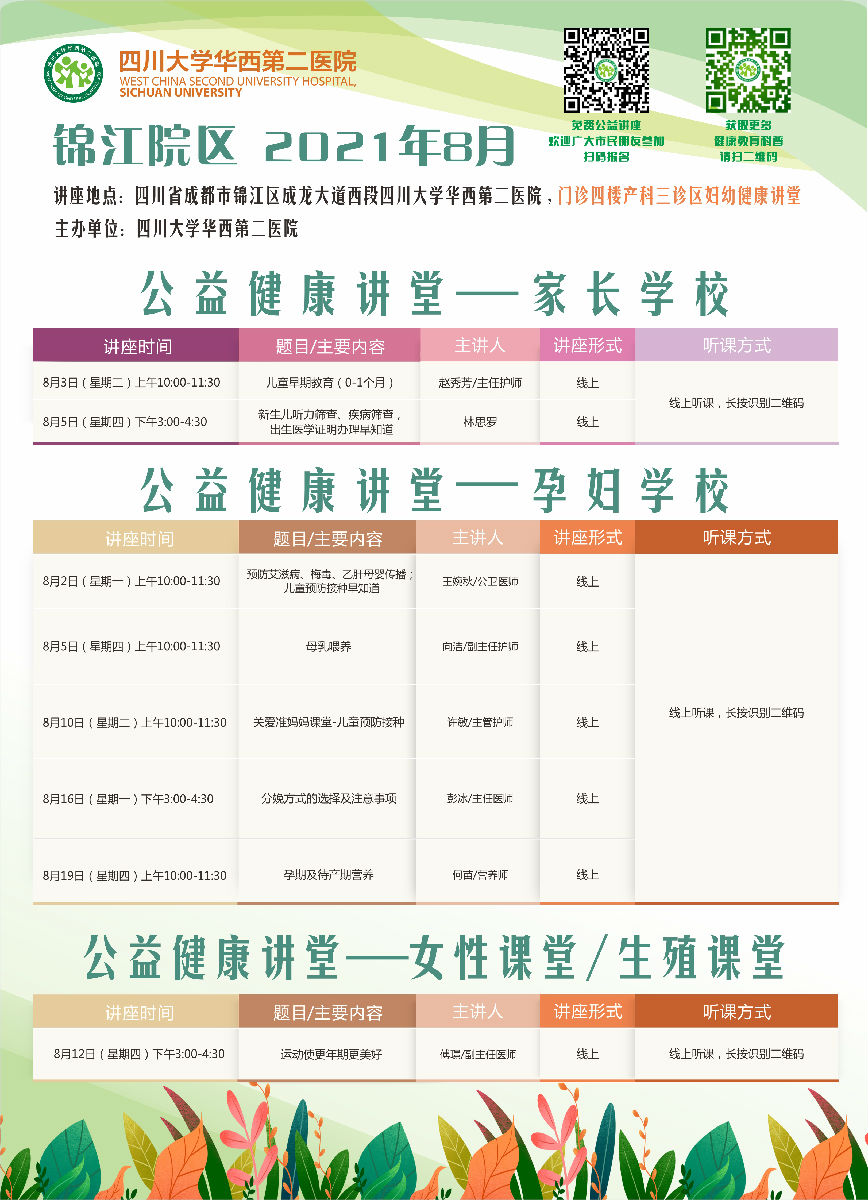 四川大学华西第二医院2021年8月公益家长学校/孕妇学校课程表