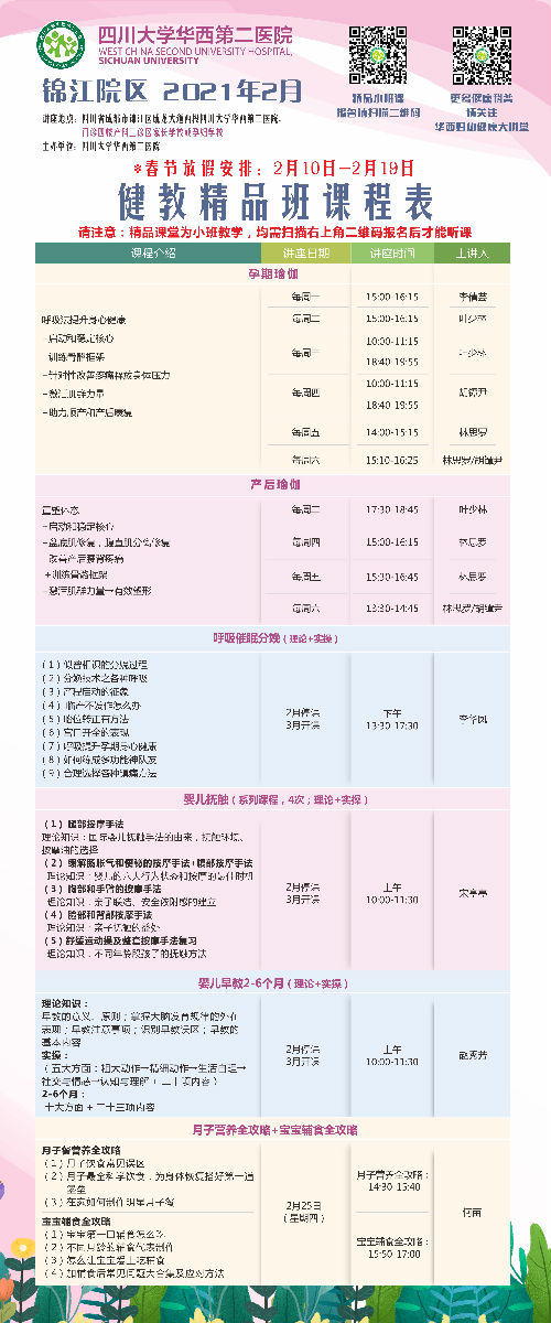 四川大学华西第二医院2021年2月健康教育精品班课程表