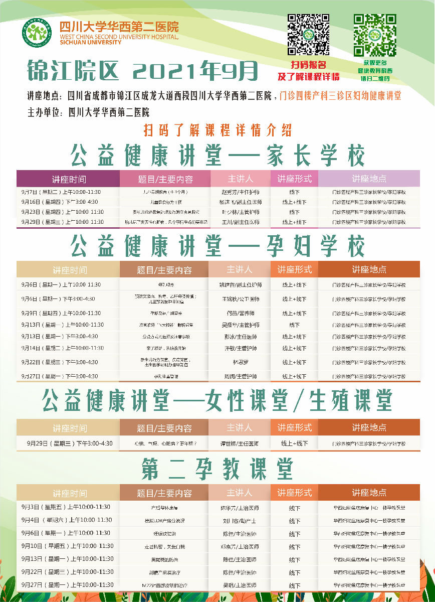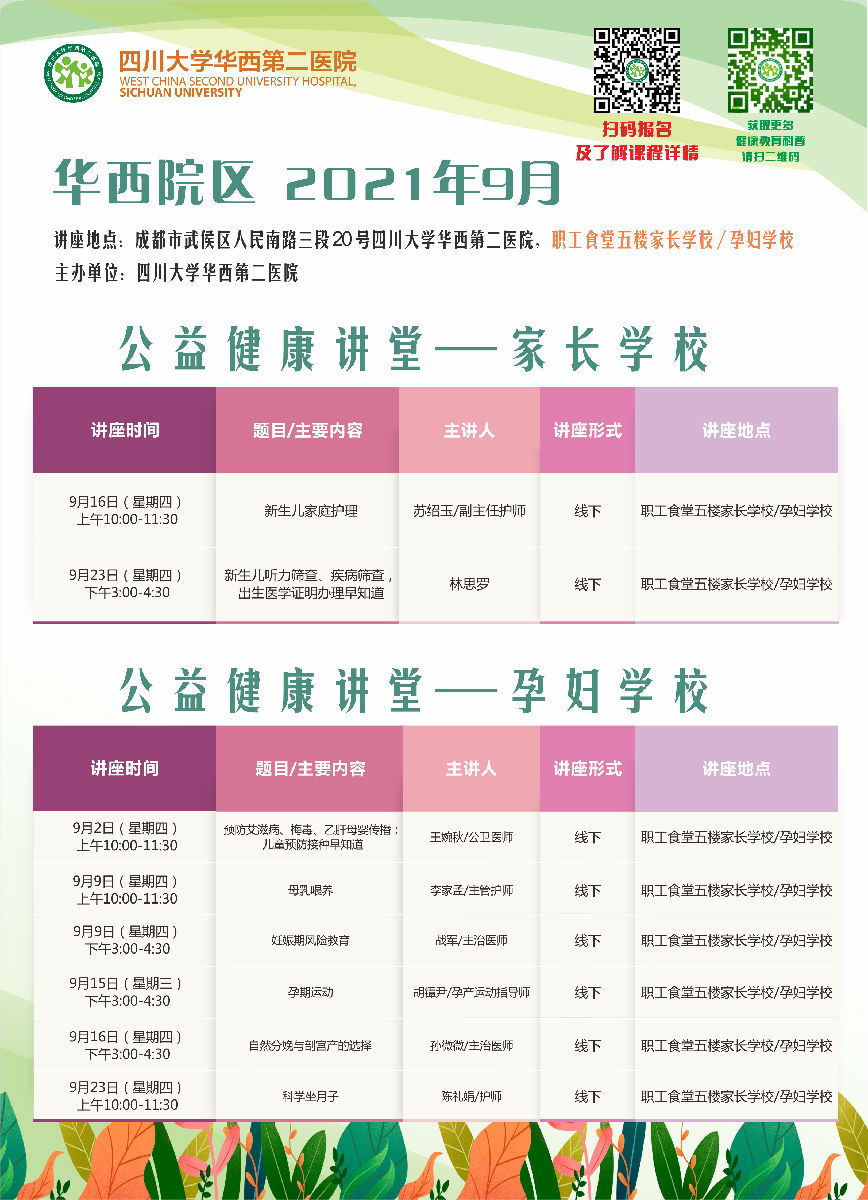 四川大学华西第二医院2021年9月公益家长学校/孕妇学校课程表