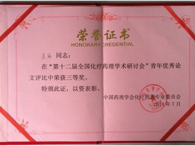 祝贺我院药学部王丽获“第十二届全国化疗药理学术研讨会”青年优秀论文三等奖