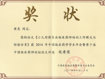 祝贺药学部黄亮获“2014年中国临床药学学术年会暨第十届中国临床药师论坛”优秀论文奖