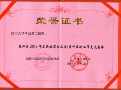 祝贺我院获成都市食品药品监督管理局、成都市卫生局“2013年度药械不良反应/事件监测工作先进集体”