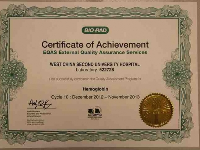 检验科HbA1c检测结果准确性再次获得奖励证书