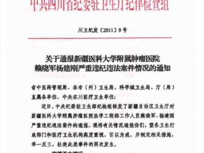 关于通报新疆医科大学附属肿瘤医院赖晓军杨建刚严重违纪违法案件情况的通知