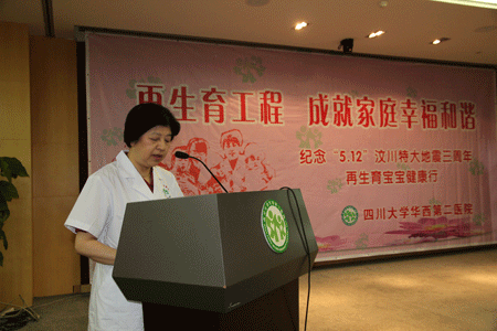 5.12汶川特大地震三周年纪念会,由医院党委书记王素霞主持,院长母得志教授总结了我院近三年来抗震救灾、灾后救援以及灾后再生育技术服务工作。作为四川省有成员伤亡家庭再生育技术服务组组长单位,我院组织并制定了再生育医疗技术服务方案、流程和信息网络建设规划;先后组织70批次共150人次赴灾区实施和加强对基层医务人员的能力培训,共对专业技术人员进行再生育服务专题培训1260人次,再生育义诊咨询4000余人次,累计行程达3万多公里。我院还充分整合利用医院的内部资源,建立绿色通道,为地震灾区再生育妇女提供优质便捷的医疗服务。目前已经与汶川、北川、绵竹、都江堰、江油、彭州、崇州、龙泉、平武、什邡、郫县、青川、绵阳游仙、苍溪、青白江区、温江区等十六个灾区县、市、区签订再生育技术服务协议;开展门诊服务4217人次,收治入院277人次,已有350名再生育妇女成功妊娠;提供优生优育咨询和产前诊断服务近5000人次,妇产科、辅助生殖技术、男科门诊服务3809人次,进行辅助生殖治疗107个周期,妊娠26个周期。