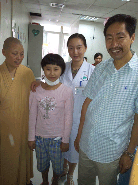 201273下午,我院血液科爱心病房迎来了一群特殊的爱心人士,他们是由长期捐助白血病患者的爱心企业介绍来的一批在成都周边几家寺院皈依的信徒,以及双流永祚寺、应天寺、黄龙溪潮音寺等几家寺院的住持及僧众。他们走访慰问了在院治疗的白血病患儿,并与受到资助的孩子合影留念。经过半小时的接触交谈,大家被这些与病魔勇敢斗争着的孩子们所感动着,也为一个个不幸的家庭感染着,各企业家纷纷解囊现场捐助。僧众们也将原计划收集起来准备用于放生的钱全部捐出,他们表示“救命更重于放生”,以后还会经常用孩子们组织捐赠活动。成都市慈善会的工作人员现场为各位爱心人士开具了捐赠证明及发票,共计捐款五万多元人民币。
