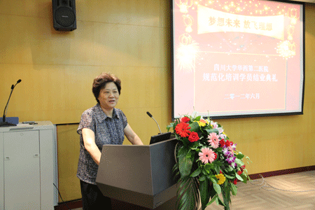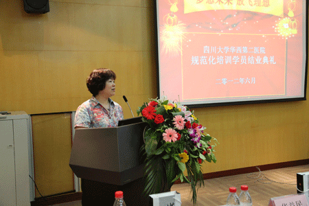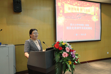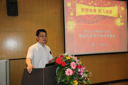 首先,四川大学医学管理处韩宇副处长作了热情洋溢的讲话。他对结业学员表示衷心的祝贺,对四川大学华西第二医院在规范化培训工作中作出的成绩给予了高度的评价,并指出临床医务人员进行规范化培训是我国医学教育发展的必然趋势。