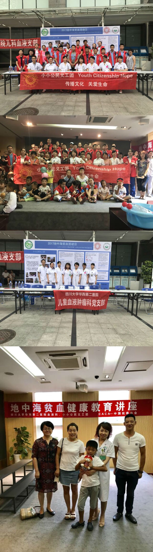 2017年7月30日,烈日炎炎,骄阳似火,儿童血液肿瘤科和由成都市中学生组成的小小公民义工团志愿者举办了“地中海贫血爱心之家”活动。儿童血液党团支部的成员们积极参与了此次活动。儿童血液科朱易萍教授、产科邢爱耘教授等医护人员为地贫患儿进行了义诊和健康宣教,并作了关于地贫诊断、防治、优生优育等方面的科普讲座。移植成功的患儿家长还进行了关于移植后家庭护理、社保报销等方面的经验分享。今年已是小小公民义工团参加“地中海贫血爱心之家”活动的第四年,继成功为3名家庭贫困的移植患儿募捐后,义工团还拟为第4位贫困家庭的患儿筹集造血干细胞移植费用。