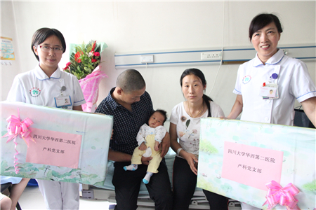 上午11点,四川省卫计委领导、我院郄明蓉副院长、产科主任刘兴会及医护人员、宣传统战部王海英主任到病房代表医院党政领导为即将出院的母子两人送行。茂县县民政局、茂县人民医院医护人员均到现场迎接患者一家。