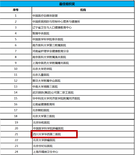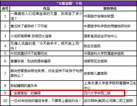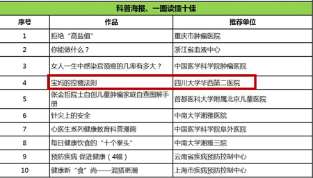 我院共上传四个作品,获得四项奖项。其中科普短片《孕期小贴士》获“科普动漫十佳”,指导者四川大学副校长张林教授,华西第二医院产科龚云辉副教授,川大艺术学院王莉莉、许亮老师,音乐音效靳泰然;海报《宝妈的控糖法则》获“科普海报、一图读懂十佳”,作者华西第二医院临床营养科李心仪;科普文章《全麦面包的骗局》获“火眼金睛十佳”,作者华西第二医院临床营养科李心仪;四川大学华西第二医院获“最佳组织奖”。