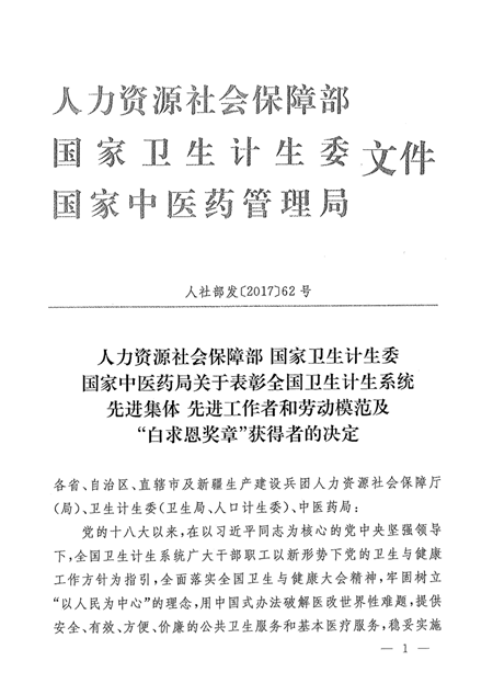 为表彰在党的十八大以来,为推进健康中国建设做出了应有贡献的先进典型,国家人力资源社会保障部、国家卫生计生委、国家中医药局设立全国卫生计生系统先进集体、先进工作者和劳动模范及“白求恩奖章”。
