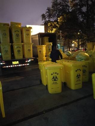 成都市医疗废物集中处置中心为了配合国家环保部对医疗废物转运车辆符合环保需要,对到我院医疗废物转运车辆进行更换。但因为车辆超高不能进出医院进行医疗废物转运。经过后勤医疗运行保障办公室与成都市医疗废物集中处置中心相关人员讨论,决定每天晚上将医疗废物转移至医院前院靠地下车库入口旁进行转运上车。为了不影响医院行人及患者的行走,保证医疗废物密闭安全转运,医疗运行保障办公室每天安排4位工人从21:00开始,直到次日凌晨3-4点才完成350袋左右的医疗废物转运工作。工人们在寒冷的冬夜,服从安排,任劳任怨认真完成工作。我们谢谢他们!(供稿:邓淑平、邓云清,摄影:邓淑平)