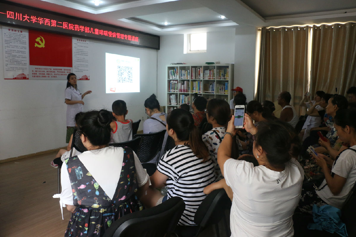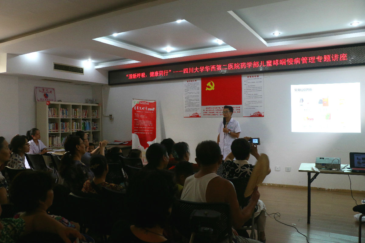 8月25日,结合青年文明号开放周活动,药学部在三圣街道喜树路社区为牵手患儿组织了“清新呼吸,健康同行”哮喘患儿慢病管理讲座,17个患儿家庭参加。黄亮药师介绍了儿童哮喘发病机制、药物选择和应急处理等;吴倩药师讲解了不同哮喘药物特殊装置使用和注意事项。他们的讲授获得一致好评。讲座后,药师还前往患儿家中,评估了用药依从性和适宜性,检查了特殊装置使用,给出了用药指导,并帮助整理了家庭小药箱。