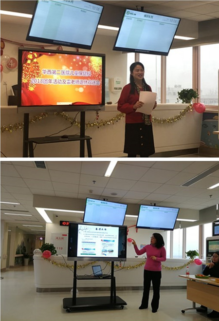 2019年1月27日,佳节前夕,儿童保健科及科党团支部在锦江院区召开2018年度工作总结会暨退休教师欢送会,全体教职工、党员、团员参加,并特别邀请退休老教师代表。作为国内最早一批设立的儿童保健科室,经过三十年的发展,逐步形成亚专业齐全、人才梯队完备的独立特色学科。时值改革开放四十周年,恰逢医院建院三十周年庆,儿童保健科在锦江院区召开双院区工作总结会,同时开展新职工欢迎活动暨退休老教师欢送会,科室张灯结彩,还有萌萌的迎宾—小猪佩奇,现场氛围欢欣。
