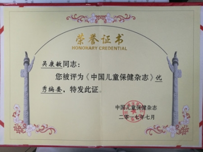 祝贺吴康敏教授获《中国儿童保健杂志》“优秀编委”称号