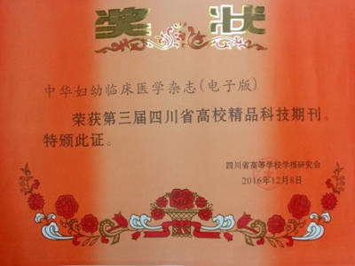 祝贺《中华妇幼临床医学杂志(电子版)》荣获2016年四川省高校精品科技期刊