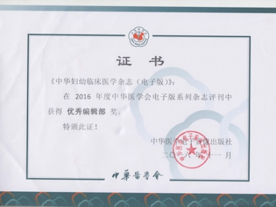 祝贺《中华妇幼临床医学杂志(电子版)》荣获中华医学会 “优秀编校质量奖”,“优秀期刊奖”和“优秀编辑部奖”