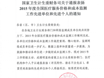 祝贺我院周海清老师荣获国家卫生计生委2015年度全国医疗服务价格和成本监测工作“先进个人”