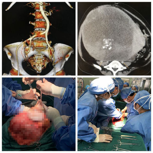 患者刘某为45岁女性,10+年前自及扪及腹部肿块,持续缓慢长大,因讳疾忌医未予就诊,3+月前因包块巨大、严重便秘、食欲下降及体重减轻终于至我院李征宇医师门诊就诊。医生查体提示腹部实性占位超过足月孕大,体积巨大,固定,上缘达剑突,占据整个腹腔。CT提示子宫体积明显增大,大小约25.3*21.8*24.8cm,盆腹腔左侧见囊性占位,大小约22.4*11.7*18.7cm,考虑巨大实性占位为子宫来源恶性肿瘤,盆腔巨大囊性占位为巧克力囊肿。同时该患者合并下肢静脉血栓及输尿管扩张,有两次腹部手术史。该患者病情疑难、危重,预估手术困难、术中大出血风险极大。入院后完善腹部大血管CTA,经血管三维重建明确大血管与子宫肿瘤的关系,请泌尿科、血管外科、麻醉科会诊并提请妇科全科讨论,彭芝兰、王平教授给予了宝贵的指导和建议。做好充分评估及术前准备后,于2019年6月28日李征宇医师主刀施行了盆腹腔巨大包块切除+子宫及双附件切除+大网膜切除术。术中见子宫增大超过足月孕,形态失常,被腹腔脏器广泛致密粘连包埋,后壁呈腹膜外位,与腹膜后大血管关系密切。瘤体血供极丰富,粘连致密且解剖关系失常,故手术极其困难。由于术中出血及解除压迫后血容量再分布,患者一度病情危重,但在麻醉科罗林丽医师和手术室护理团队(杨苹护士等)的高效配合下,迅速予输血扩容等处理,术中输血红细胞悬液7U,血浆1000ml。尽管危险重重,最终仍在医护的共同努力下切除了直径约30cm、重达8kg的巨大包块,顺利完成手术。患者术后转入监护室严密监护,现病情平稳。