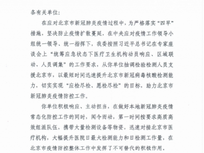 国家卫健委对我院及检验科赴京增援核酸检测人员发出表扬信