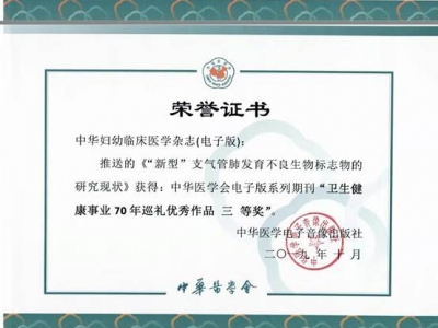 喜讯▏《中华妇幼临床医学杂志(电子版)》刊载的《“新型”支气管肺发育不良生物标志物的研究现状》荣获中华医学会卫生健康事业70周年巡礼优秀作品三等奖
